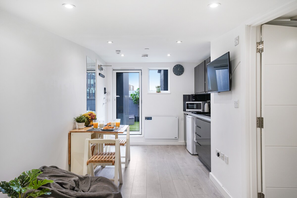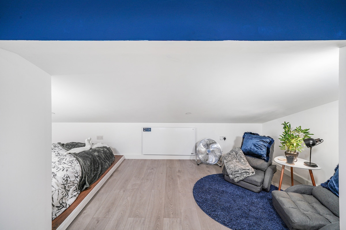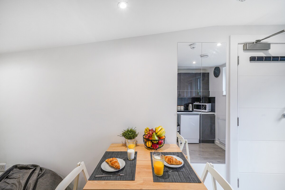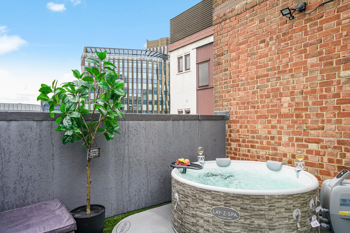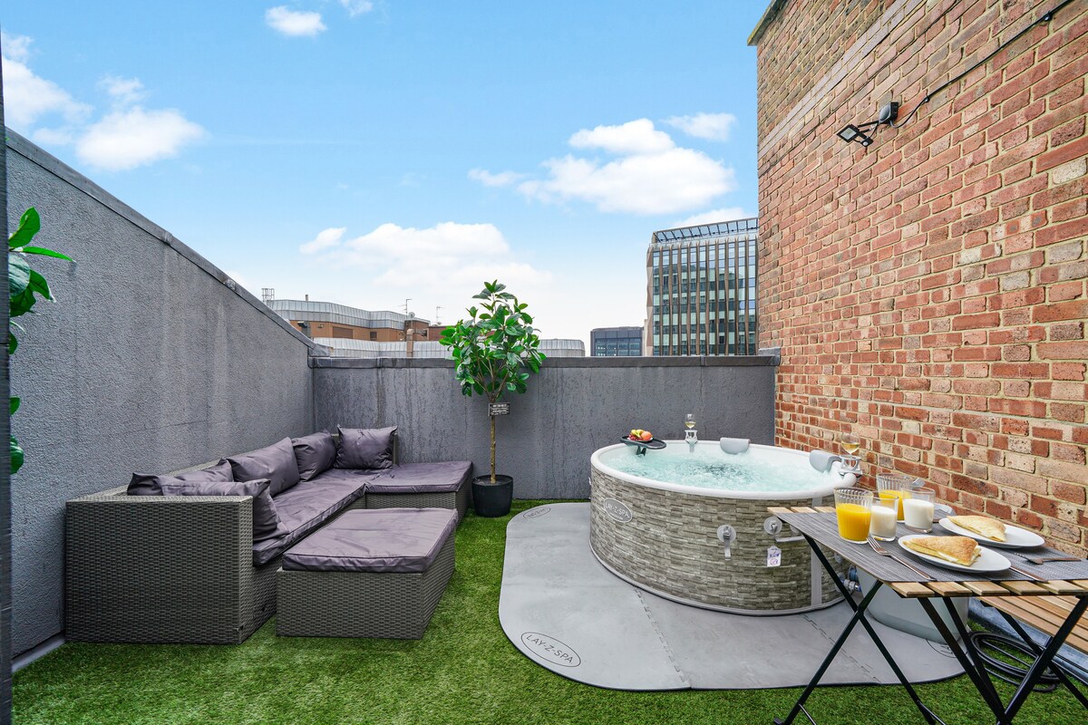 Greater LondonExplore central London from our fully furnished studio. Unwind on the spacious terrace after city adventures. Perfect for explorers, with attractions, restaurants, and 2 tube stations just 2 minutes away. Enjoy a private rooftop terrace, hot tub, and a cinematic experience with TV and projector. Please note: Going up 3 sets of stairs is the only challenge to reach this urban oasis. Also, the cozy sleeping area has a low ceiling. Book now for a unique London stay!